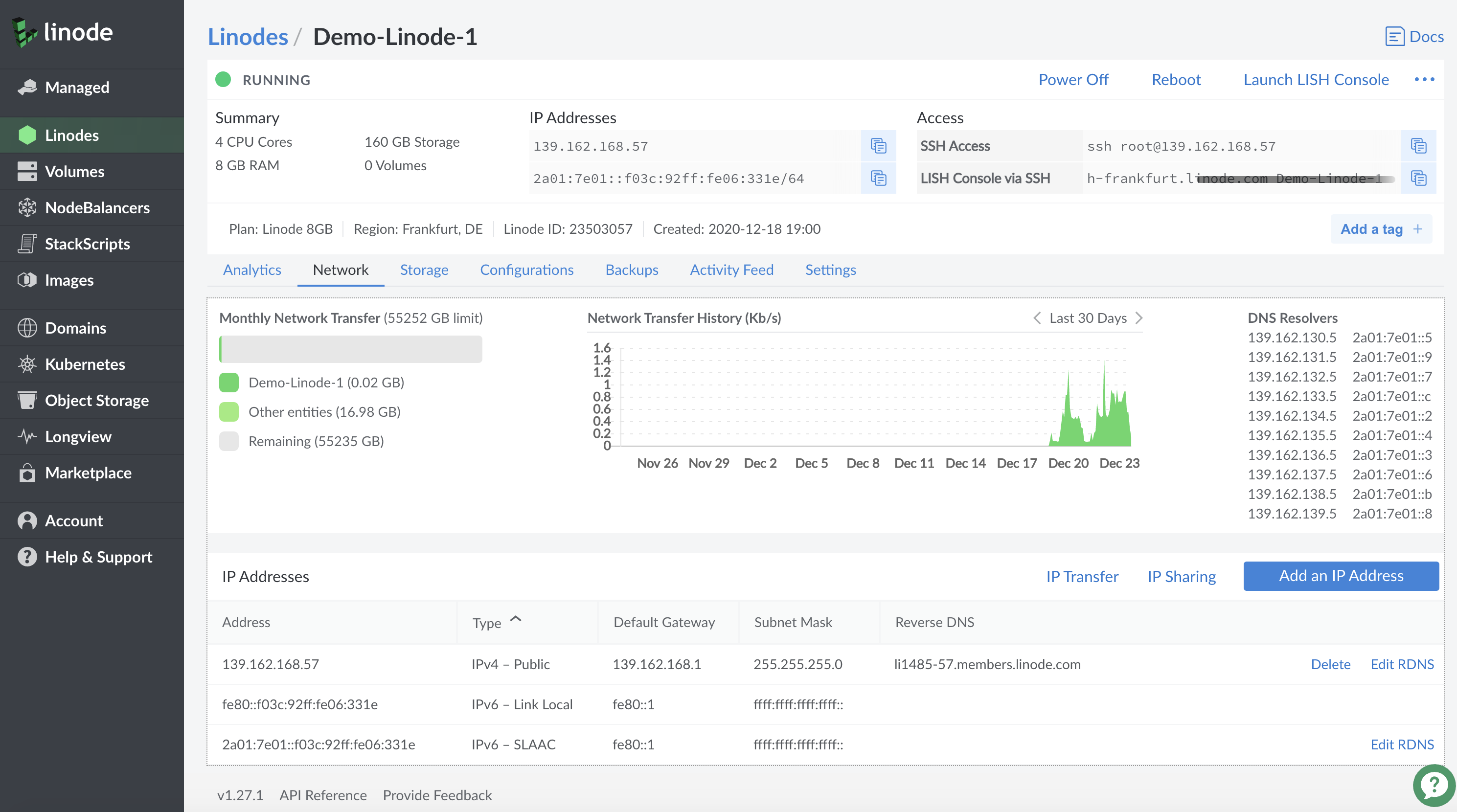Your Linode has a unique IP address that identifies it to other devices and users on the internet.