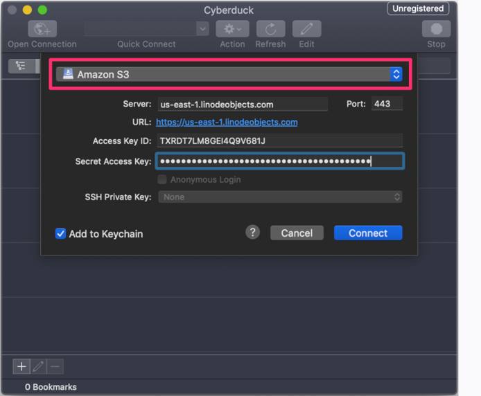 us-east-1.linodeobjects.comif the bucket is in the Newark data center,eu-central-1.linodeobjects.comif the bucket is in the Frankfurt data center, orap-south-1.linodeobjects.comif the bucket is in the Singapore data center.Enter the access key in the Access Key ID field, and the secret key in the Secret Access Key field.