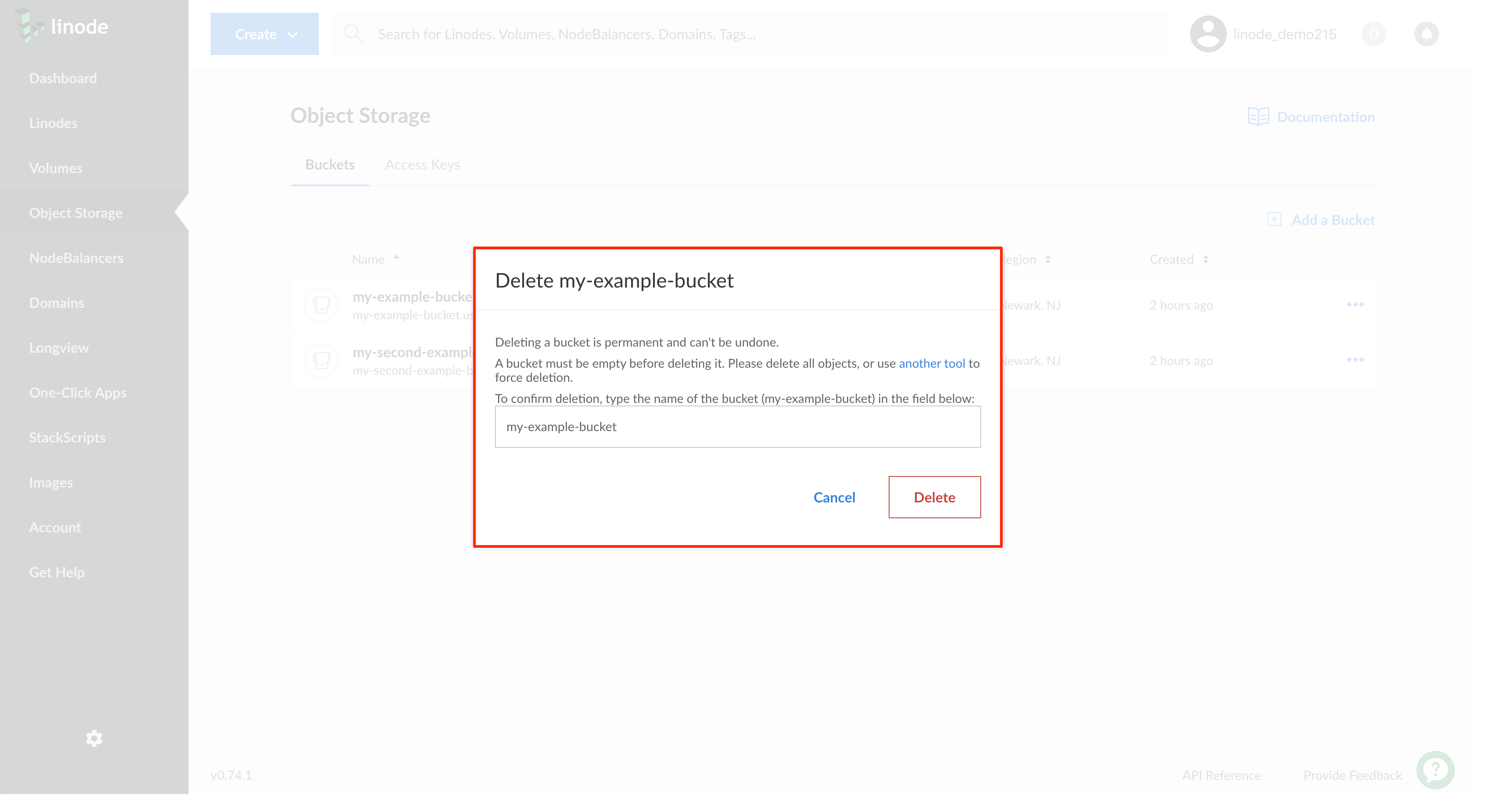 NoteYou can only delete an empty Object Storage bucket. See the Delete Objects from a Bucket how-to for information on deleting a bucket’s objects using the Cloud Manager.
