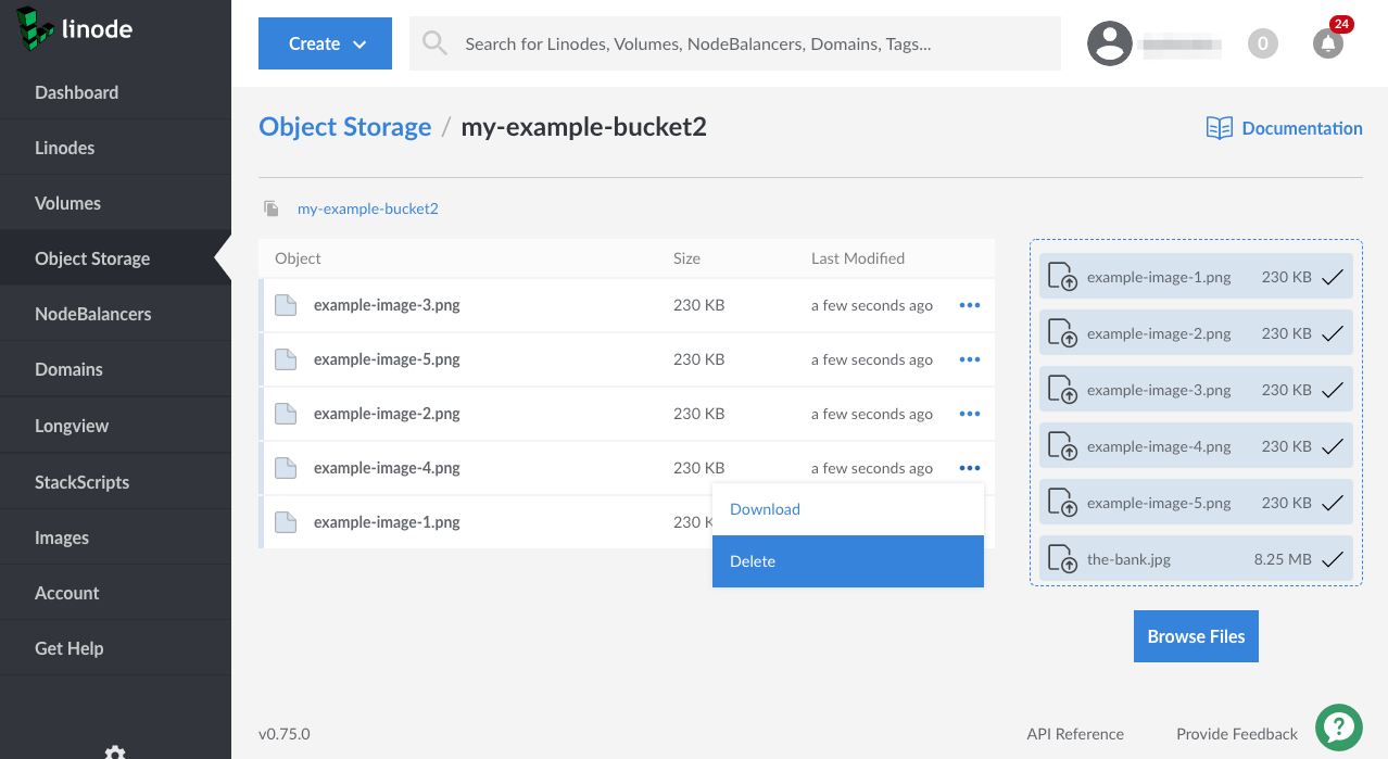 http://my-example-bucket.us-east-1.linodeobjects.com/example.txt, wheremy-example-bucketis the label of the bucket,us-east-1.linodeobjects.comis the cluster where the bucket is hosted, andexample.txtis the name of the object.To download an object, right click the object and select Download, or click Download As if you’d like to specify the location of the download.