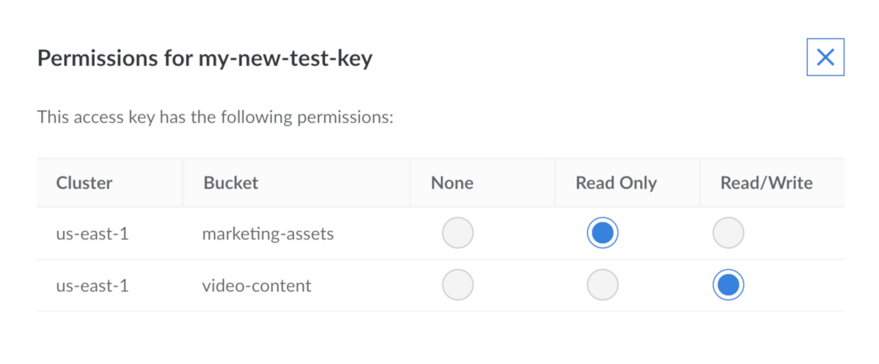 An access key with limited permissions displays all the buckets and their selected permissions.