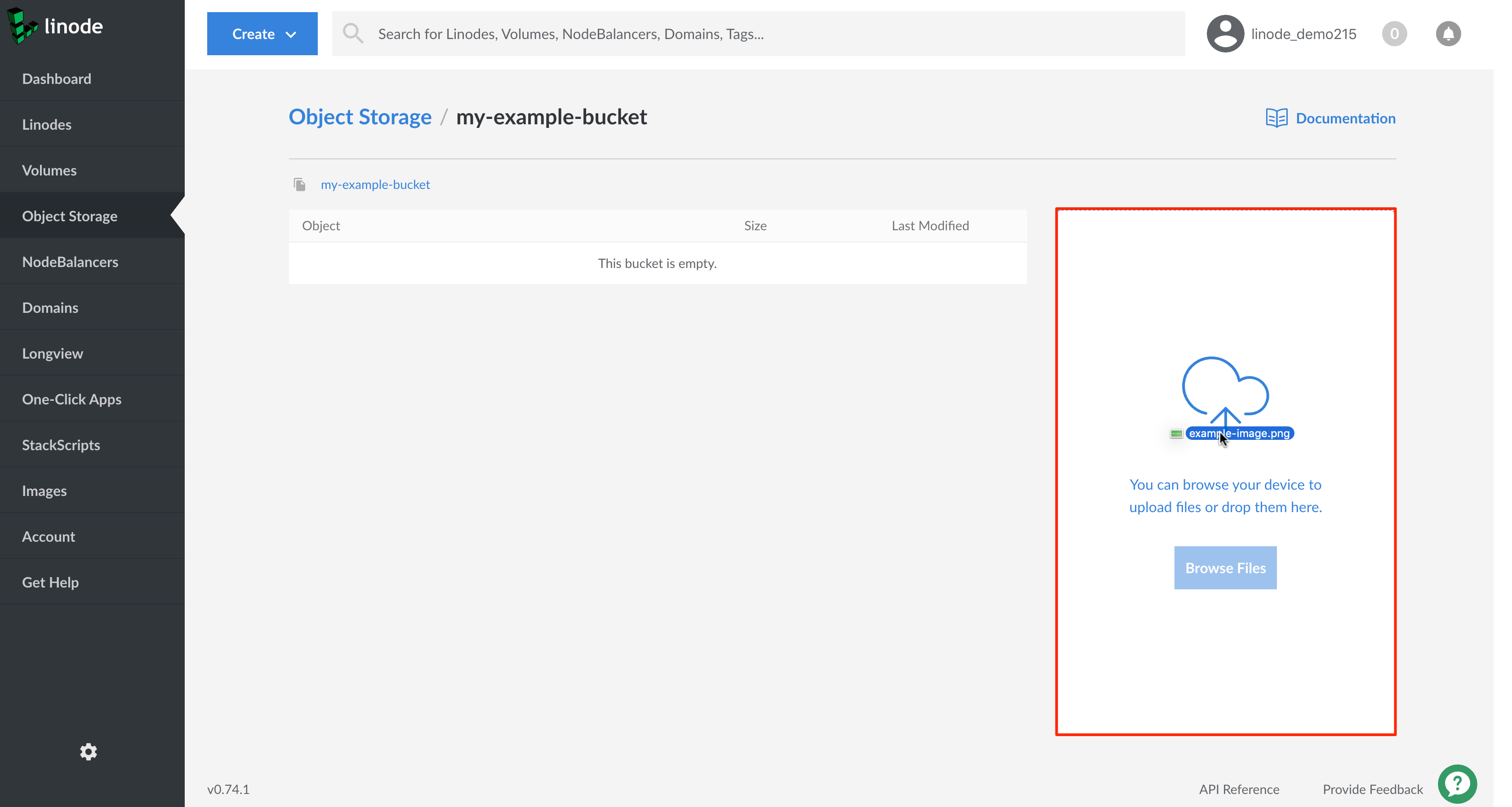 The bucket’s Objects Listing Page appears. In the example, the my-example-bucket does not yet contain any objects. You can use the Upload Files Pane to drag and drop a file from the local computer to the object storage bucket.
