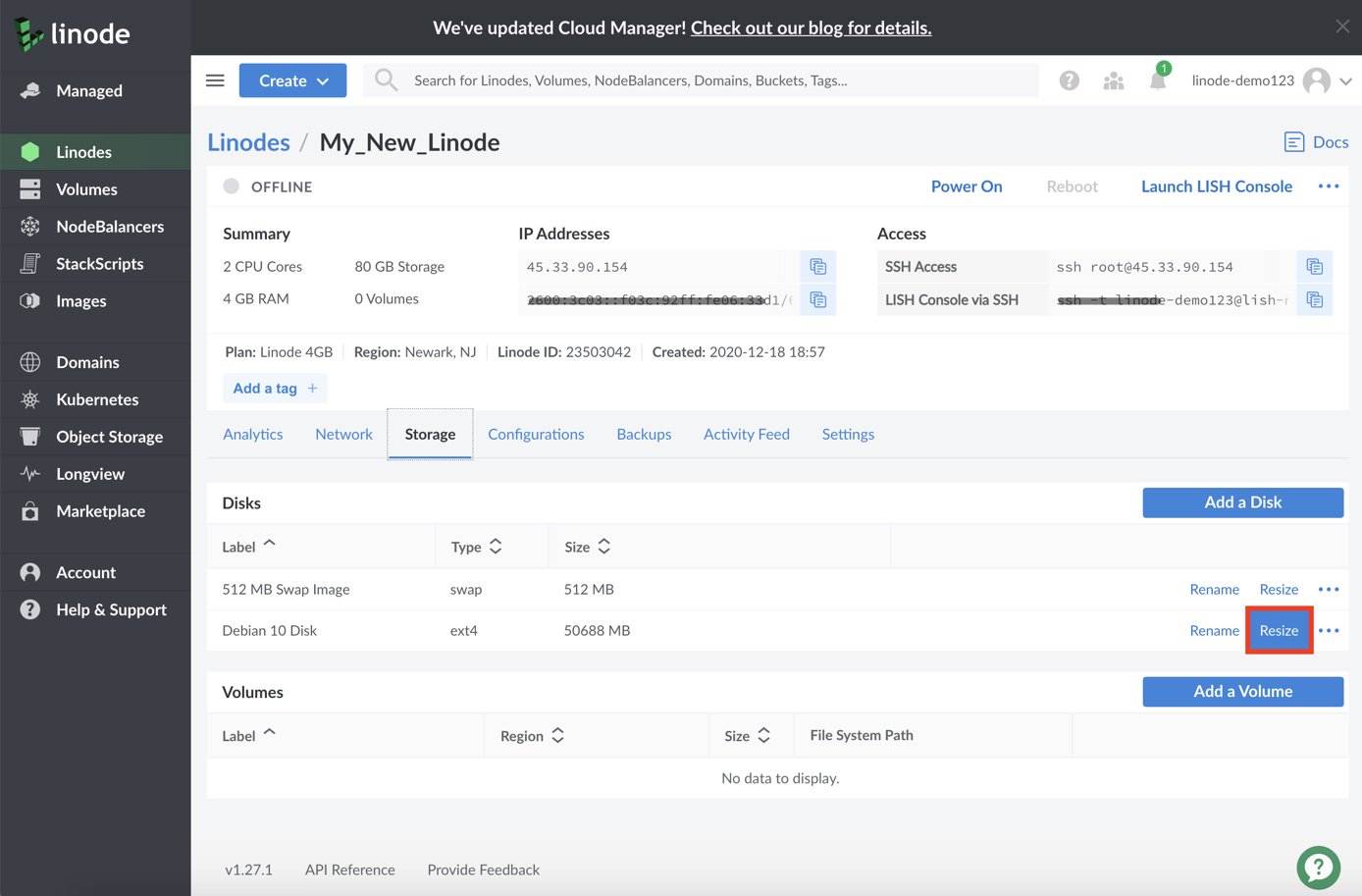 Navigate to your Linode’s Storage tab to view your current disk allocation. Click on the Resize button next to the disk you’d like to allocate the extra storage to.