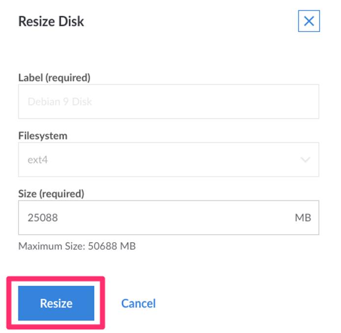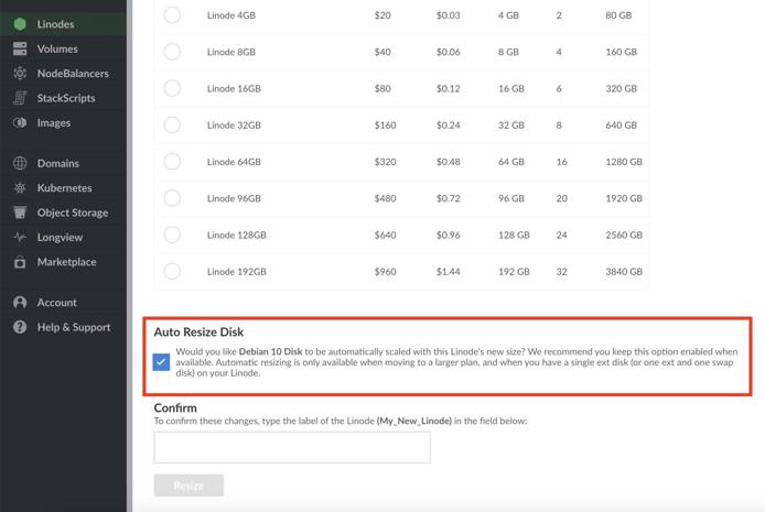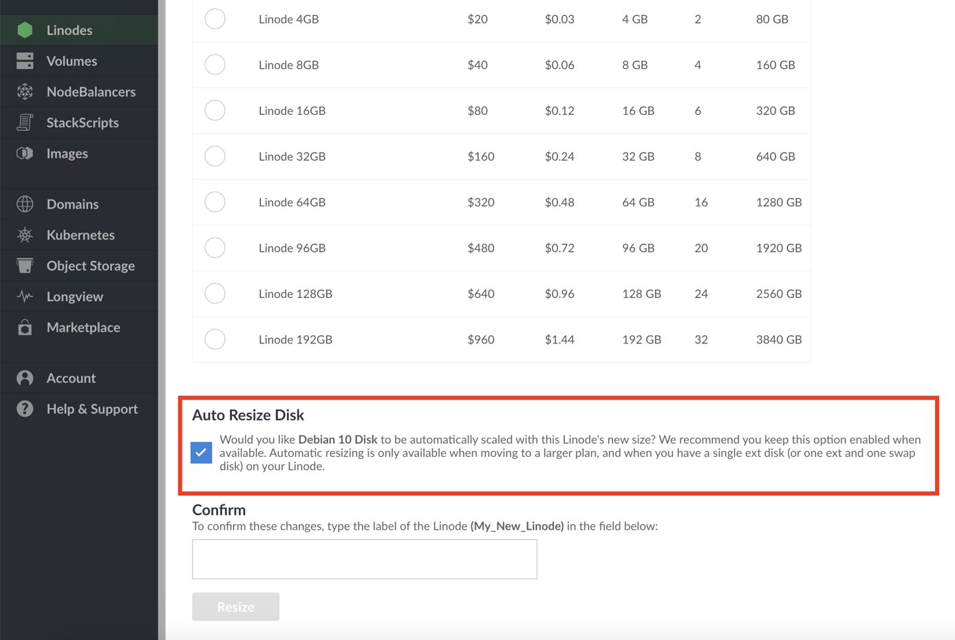 Automatic resizing is only available when moving to a larger plan, and when you have a single ext disk (or one ext and one swap disk) on your Linode.Select a plan and enter the label of the Linode in the Confirm field to confirm the changes.