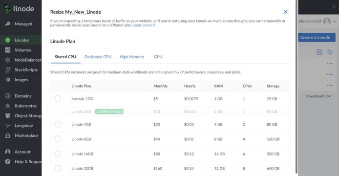 NoteLinodes can be resized to a smaller or larger plan. A Shared plan can also be converted to a High Memory plan, or vice versa.