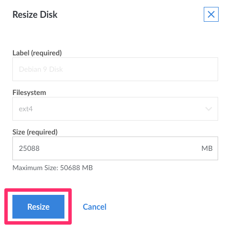 Click the Resize button. Your Linode is then powered off and moved to another host. Depending on the size of your Linode, this process can take up to one hour.