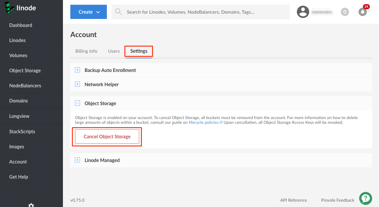 If you have removed all of the buckets, but you have not also cancelled the Object Storage service, the account is billed at a flat rate of $5 per month (prorated) for the service. Make sure that you complete each step of this section to fully cancel the Object Storage service and to stop billing for it. For more information, see our Pricing and Limitations guide.After you’ve deleted all the buckets, navigate to the Account page in the left-hand navigation. Click the Settings tab. In the menu, you should see a setting for Object Storage: